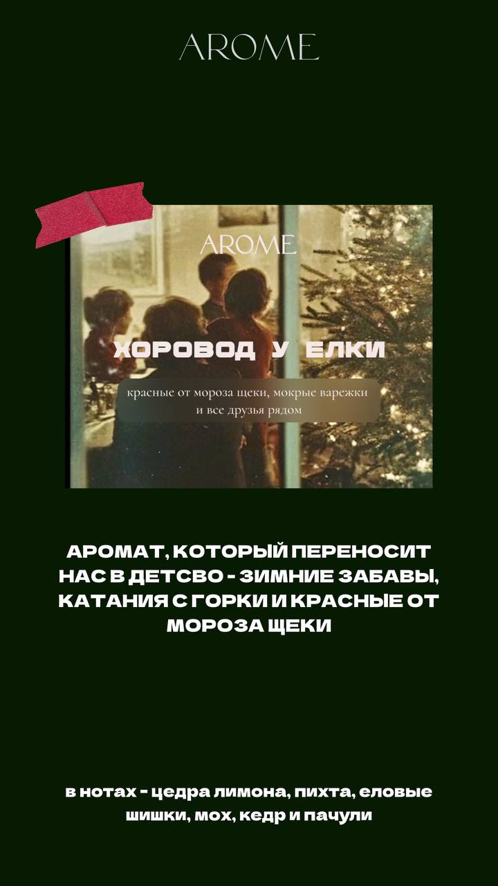 Хоровод у ёлки - аромат, который переносит нас в детство - зимние забавы, катания с горки и красные от мороза щеки ноты аромата: цедра лимона, пихта, еловые шишки, мох кедр и пачули