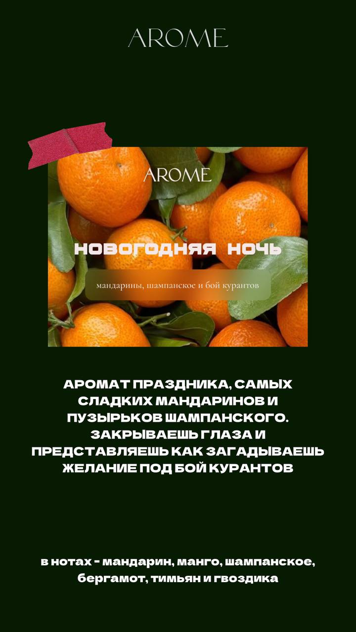 Новогодняя ночь - аромат праздника, самых сладких мандаринов и пузырьков шампанского. Закрываешь глаза и представляешь как загадываешь желание под бой курантов ноты аромата: мандарин, манго, шампанское, бергамот, тимьян и гвоздика