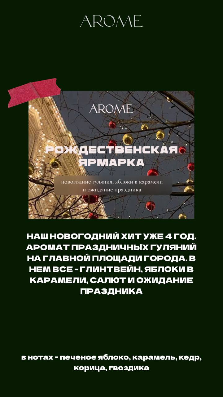 Рождественская ярмарка - аромат ХИТ уже 4 год. Аромат праздничных гуляний на главной площади города. В нем все - глинтвейн, яблоки в карамели, салют и ожидание праздника ноты аромата: печеное яблоко, карамель, кедр, корица, гвоздика
