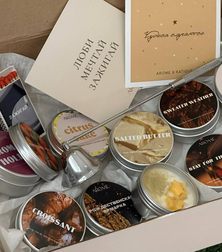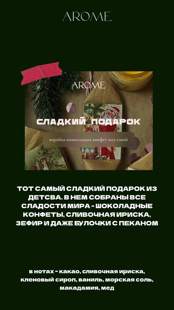 Сладкий подарок - тот самый сладкий подарок из детства. В нем собраны все сладости мира - шоколадные конфеты, сливочная ириска, зефир и даже булочки с пеканом ноты аромата: какао, сливочная ириска, кленовый сироп, ваниль, морская соль, макадамия, мед