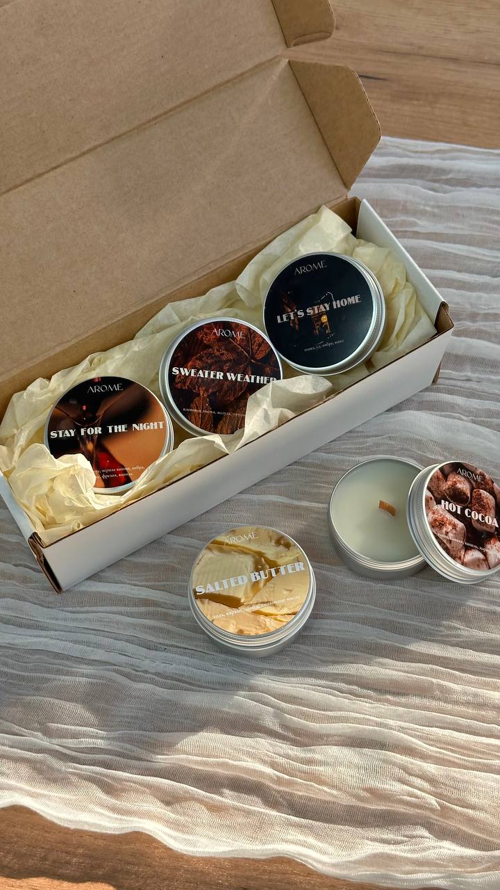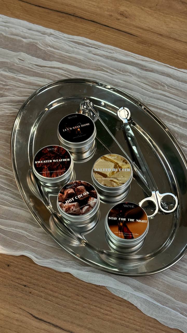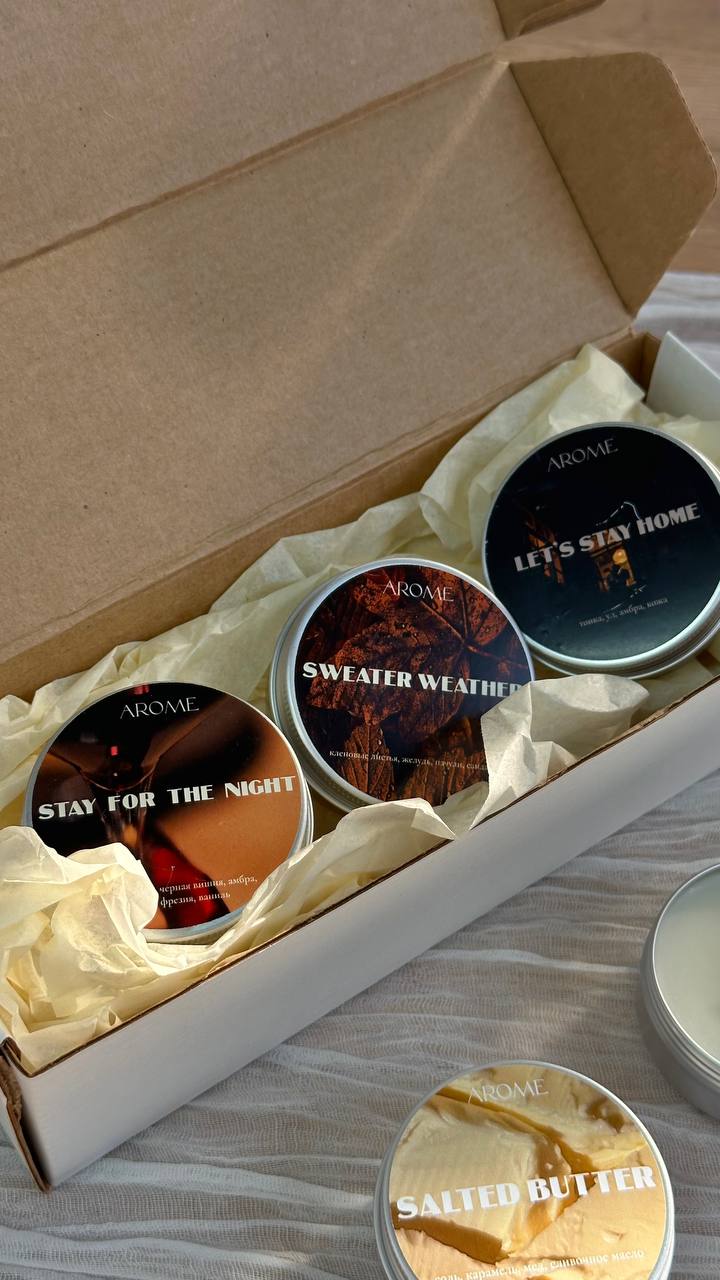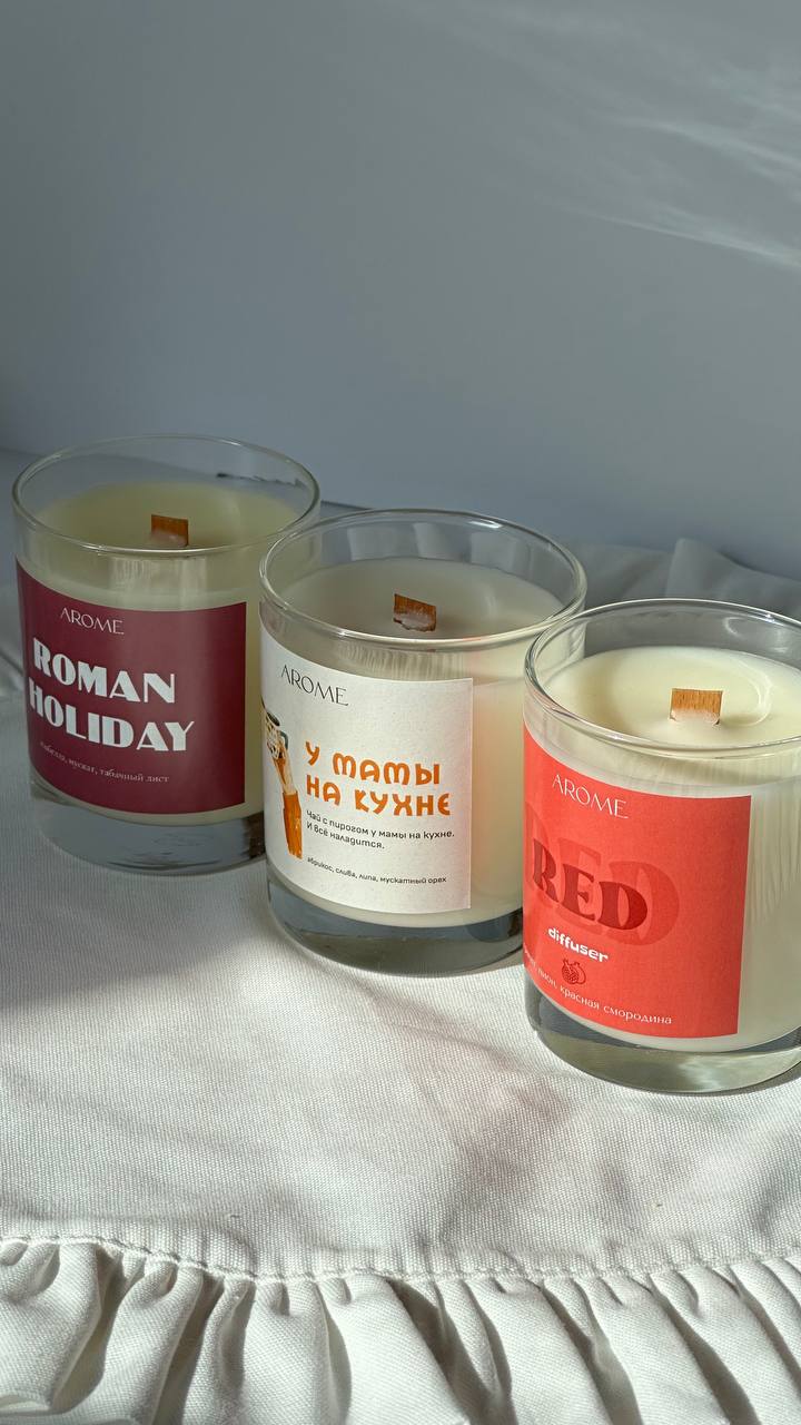 Relax, baby это успокаивающий и сбалансированный аромат, сочетающий в себе ноты лемонграсса и черной смородины с оттенками пачули и сахарного тростника Very berry мягкое ягодное сочетание - вишня, малина, слива и клубника в сахаре Friday mood аромат коктейля на летней веранде - сладкий апельсин, манго, персик и игристое Watermelon sugar сочный, игривый и по-настоящему летний — как глоток холодного лимонада в жаркий день. аромат брызжет яркостью, искрится кислинкой и дарит настроение каникул Summer vacation яркое и легкое сочетание аромата орхидеи и морской соли Горячий круассан аромат утренней пекарни: хрустящая золотистая корочка, тёплое сливочное тесто и капля мёда GRAY томный, мягкий и манящий как изысканный кашемир, с нотами пудры, сандала и бергамота RED яркий, насыщенный и смелый, аромат сочного гранатового лимонада с яркой кислой нотой красной смородины Цитрусовый кекс сочный аромат влажного кекса, пропитанного сиропом, когда каждую молекулу запаха хочется вдохнуть поглубже, каждый кусочек посмаковать с чаем. Дневник памяти вкусный древесный аромат с яркой перчинкой, он окутает Вас осенним настроением и погрузит в воспоминания Однажды в Стамбуле невероятно теплый и мягкий аромат, вкусное сочетание кокоса, сандала и бобов тонка Любовь это не классическое сладкое, приторное сочетание, а что-то пудровое и нежное, как и сама любовь Римские каникулы сочный аромат винограда с пряными нотами табака и древесной коры Мужчины и деньги насыщенный, благородный и дорогой аромат, запах кожаного салона нового автомобиля и сладость сандала образуют сочетание, присуще дорогому и сложному парфюму Табак и ваниль классика в ароматах начинается с этого сочетания. Пряный, насыщенный, который раскрывается сладкой ванилью, сухофруктами и листьями табака