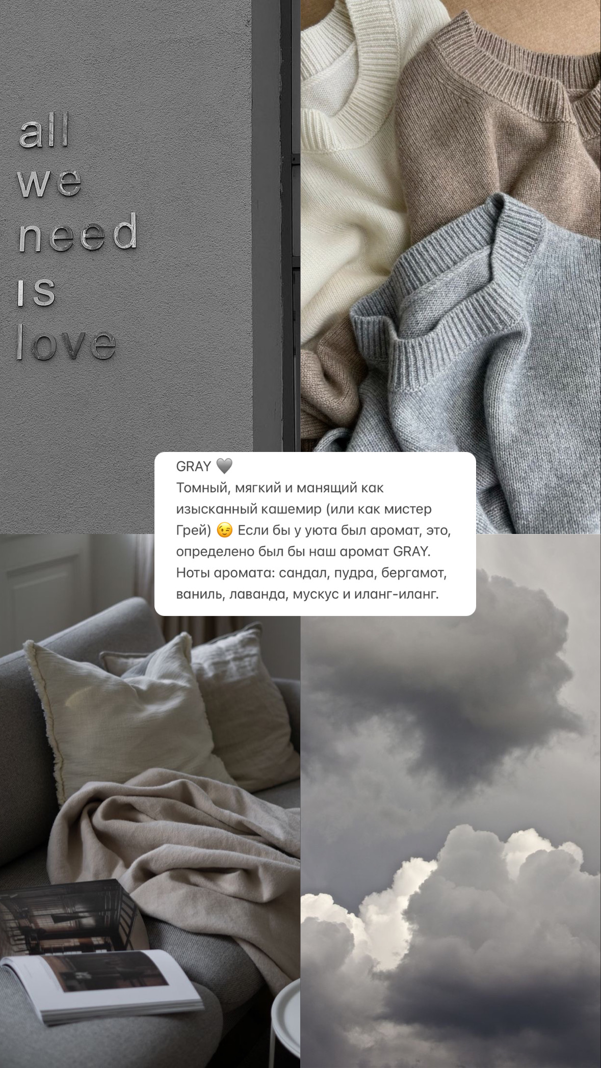 GRAY тип аромата: пудовый, пряный томный, мягкий и манящий как изысканный кашемир (или как мистер Грей) ноты аромата: сандал, пудра, бергамот, ваниль, лаванда, мускус и иланг-иланг
