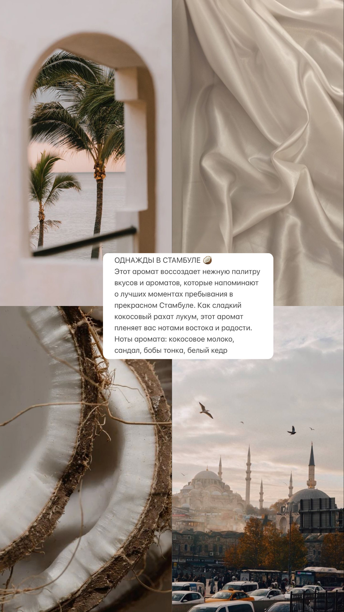 Однажды в Стамбуле тип аромата: сладко-пряный этот аромат напоминает о лучших моментах пребывания в прекрасном Стамбуле. как сладкий кокосовый рахат лукум, этот аромат пленяет вас нотами востока и радости. ноты аромата: кокосовое молоко, сандал, кокос, амирис, бобы тонка, белый кедр
