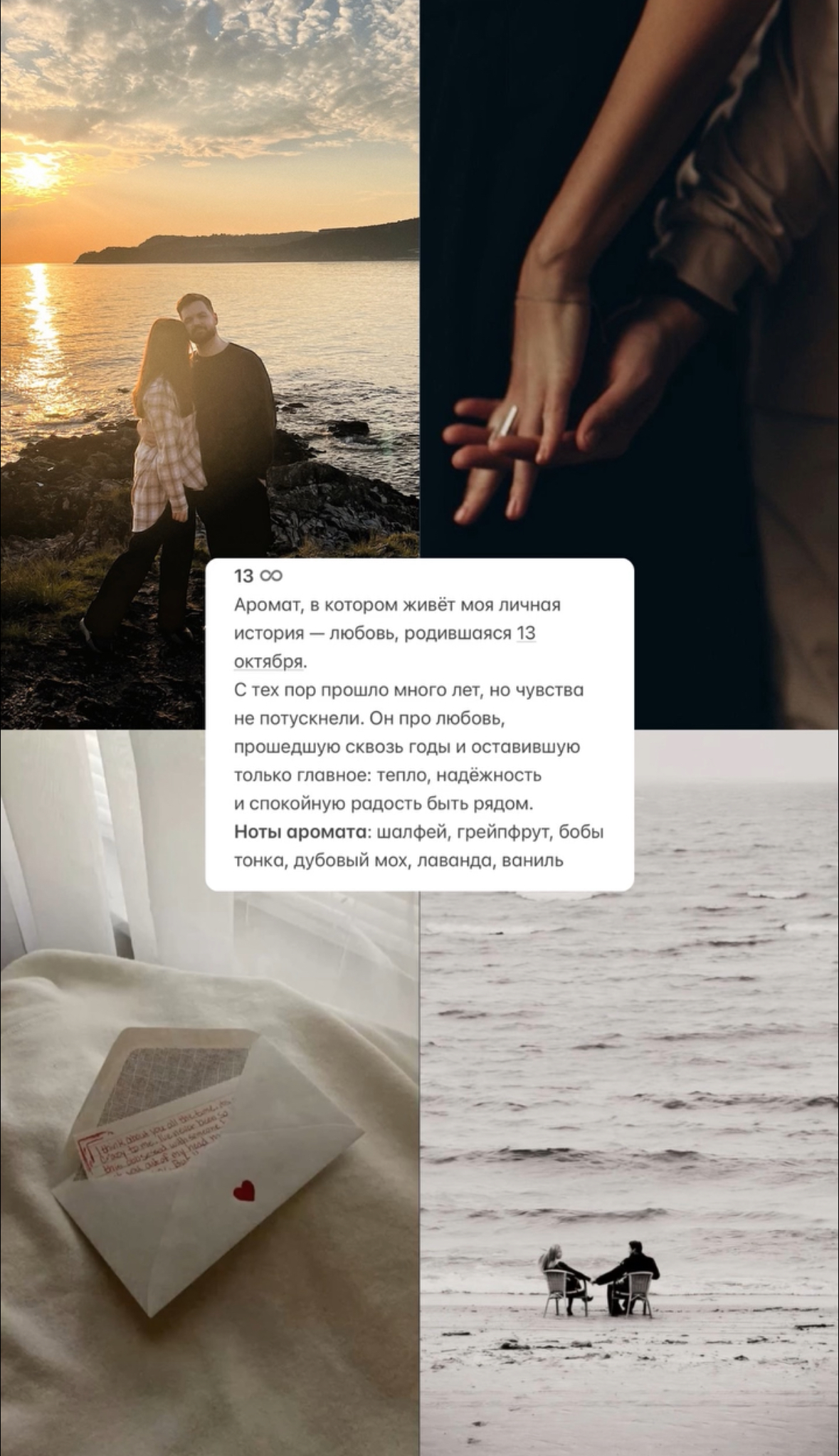 парфюмерная вода 5мл - 990₽ 18мл - 2490₽ 30мл - 2890₽ стойкость - 6 часов | яркое звучание и шлейф тип аромата: пряный аромат, в котором живёт моя личная история — любовь, родившаяся 13 октября. он про любовь, прошедшую сквозь годы и оставившую только главное: тепло, надёжность и спокойную радость быть рядом. ноты аромата: шалфей, грейпфрут, бобы тонка, дубовый мох, лаванда, ваниль
